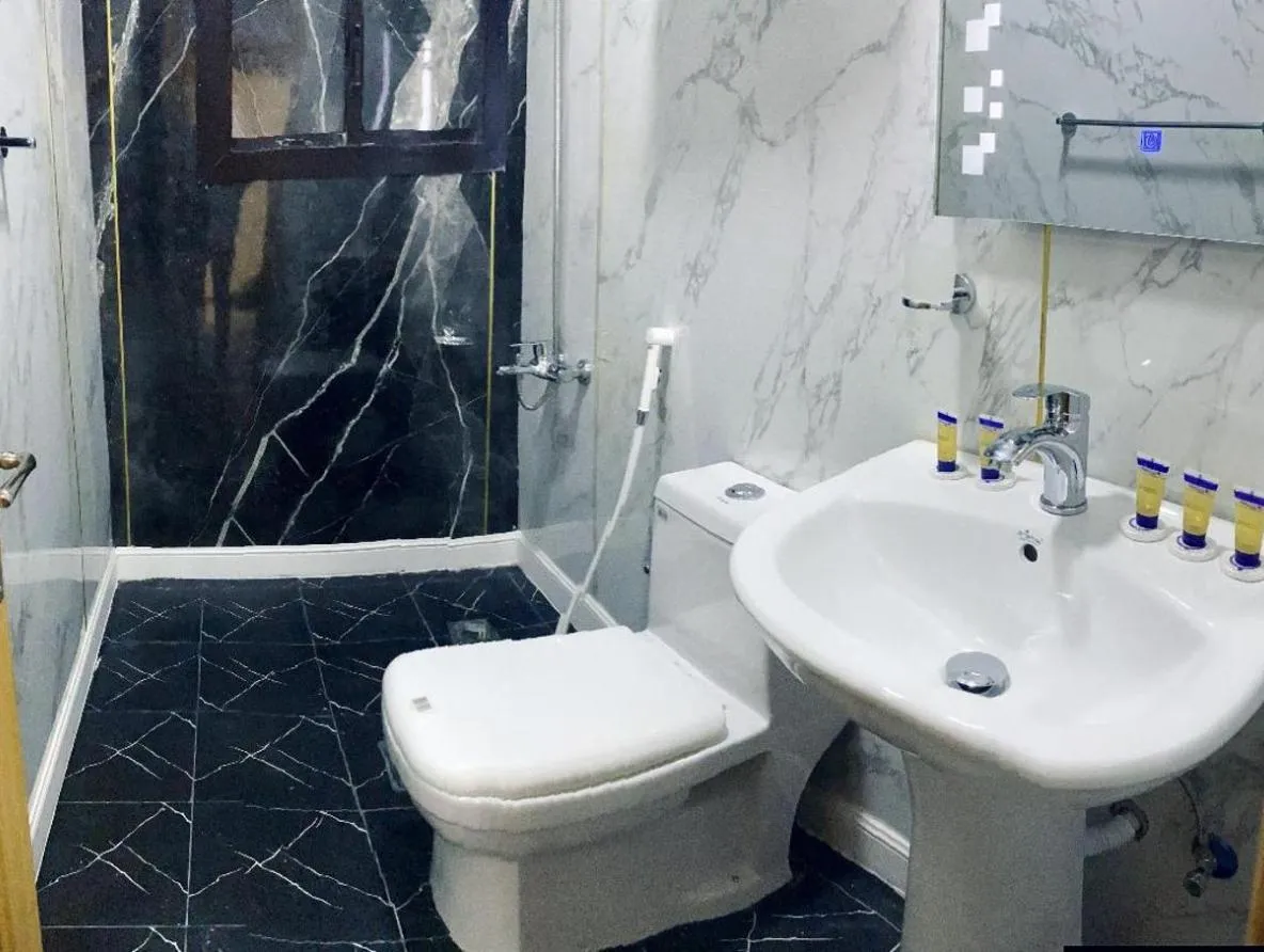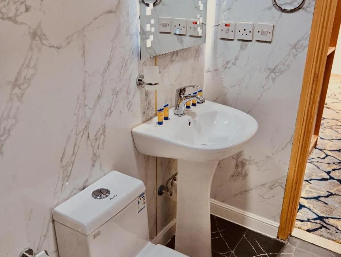 حمام خاص مجهز: يحتوي على مستلزمات استحمام مجانية.